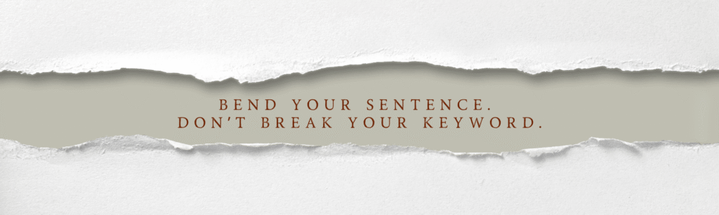 THE FIX: Bend your sentence, don’t break your keyword. You can’t change your keyword, but you can adjust your sentence to fit. Change the tense of your writing to match the tense of the keyword, shift your verbiage to singular instead of plural to match what’s on your list, or whatever else you can do within your website optimization efforts to make your keywords feel like they belong exactly where they are. Now is the time to flex your creativity.